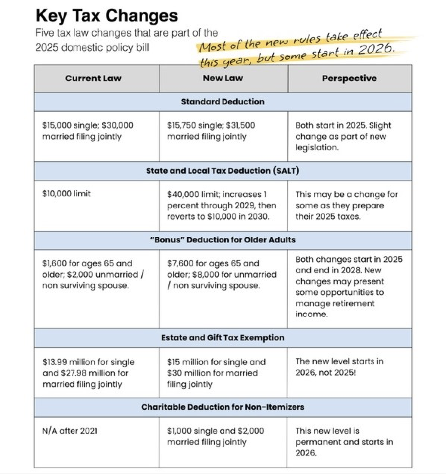 The One Big Beautiful Bill Act introduces a wide range of tax changes aimed at helping Americans across different life stages—from early-career workers to families and those approaching retirement. Whether you're earning tips, raising kids, or planning your estate, the bill includes new deductions, expanded credits, and planning opportunities designed to support your financial goals. The following sections break down key provisions to help you understand what’s changing and how you can prepare.